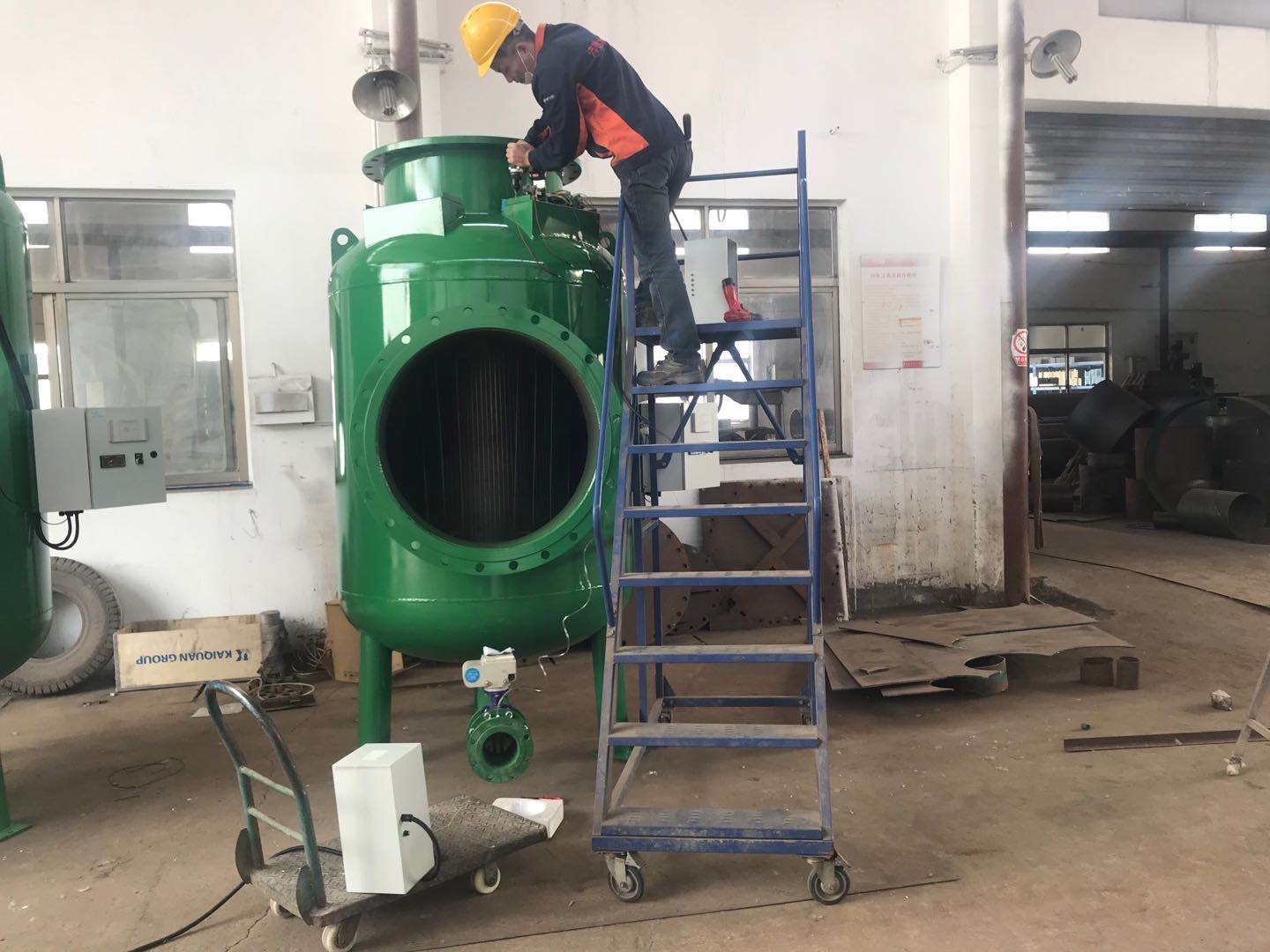 全程綜合水處理器主要由碳鋼筒體、不銹鋼網(wǎng)、高頻電磁場(chǎng)發(fā)生器、電暈場(chǎng)發(fā)生器及排污裝置等組成。通過(guò)活性鐵質(zhì)濾膜,機(jī)械變徑孔阻擋及電暈效應(yīng)場(chǎng)三位一體的綜合過(guò)濾體,吸附、濃縮在實(shí)際運(yùn)行工礦下水系統(tǒng)形成的硬度物質(zhì)及復(fù)合垢,降 低其濃度,達(dá)到控制污垢及大部分硬度垢的目的。并通過(guò)換能器將特定頻率能量轉(zhuǎn)換給被處理的介質(zhì)—水,形成電磁化水,使其成垢離子間的排列順序位置發(fā)生扭曲變形,當(dāng)水溫升高到一定程度時(shí),處理后的水需經(jīng)過(guò)一段時(shí)間方能恢復(fù)到原來(lái)的狀態(tài)。在此階段,成垢的幾率很低,因而達(dá)到控制形成硬度垢的目的。同時(shí)器壁金屬離子受到抑制,對(duì)無(wú)垢系統(tǒng)具有防腐蝕作用。此外,全程水處理器在系統(tǒng)正常運(yùn)行狀態(tài)下,可以完成防結(jié)垢、防腐、殺.菌、滅藻、過(guò)濾,控制水質(zhì)的綜合功能。
