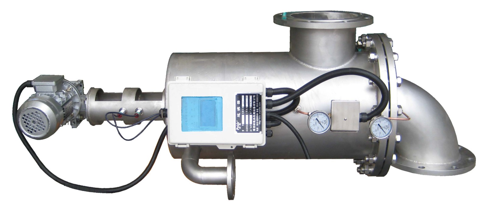 電動(dòng)吸允式過(guò)濾器,在過(guò)濾網(wǎng)內(nèi)安裝一個(gè)吸吮掃描器,掃描器被電機(jī)帶動(dòng)做螺旋運(yùn)動(dòng),在過(guò)濾器端蓋上安裝一個(gè)排污閥。清洗時(shí),電機(jī)帶動(dòng)吸吮掃描器掃過(guò)濾網(wǎng)表面,吸掉污物雜質(zhì),并通過(guò)排污閥排出過(guò)濾器。清洗時(shí)無(wú)需斷流。當(dāng)水自過(guò)濾器中流過(guò)時(shí),濾網(wǎng)逐漸積累水中的臟物、雜質(zhì)、形成過(guò)濾餅堆積在濾網(wǎng)的表面,從而導(dǎo)致進(jìn)、出水管之間出現(xiàn)水壓差,當(dāng)過(guò)濾器的壓差達(dá)到預(yù)設(shè)值時(shí),將開始自動(dòng)清洗過(guò)程,此間凈水供應(yīng)不斷流,清洗閥打開,貯污室及吸污室內(nèi)水壓大幅度下降,過(guò)濾筒與吸污管與清洗室之間通過(guò)吸嘴產(chǎn)生一個(gè)吸力,形成一個(gè)吸污過(guò)程。同時(shí),電力馬達(dá)帶動(dòng)吸污管沿軸向做螺旋運(yùn)動(dòng)。吸污器軸向運(yùn)動(dòng)與旋轉(zhuǎn)運(yùn)動(dòng)的結(jié)合將整個(gè)濾網(wǎng)內(nèi)表面清洗干凈。整個(gè)沖洗過(guò)程約35秒到90秒。排污閥在清洗結(jié)束時(shí)關(guān)閉。過(guò)濾網(wǎng)開始下一個(gè)沖洗周期。