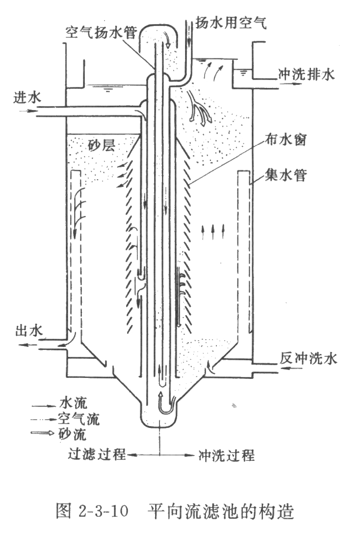 平向流濾池中,在容易積污的濾層流入處,設空氣揚水裝置以保證沖洗。