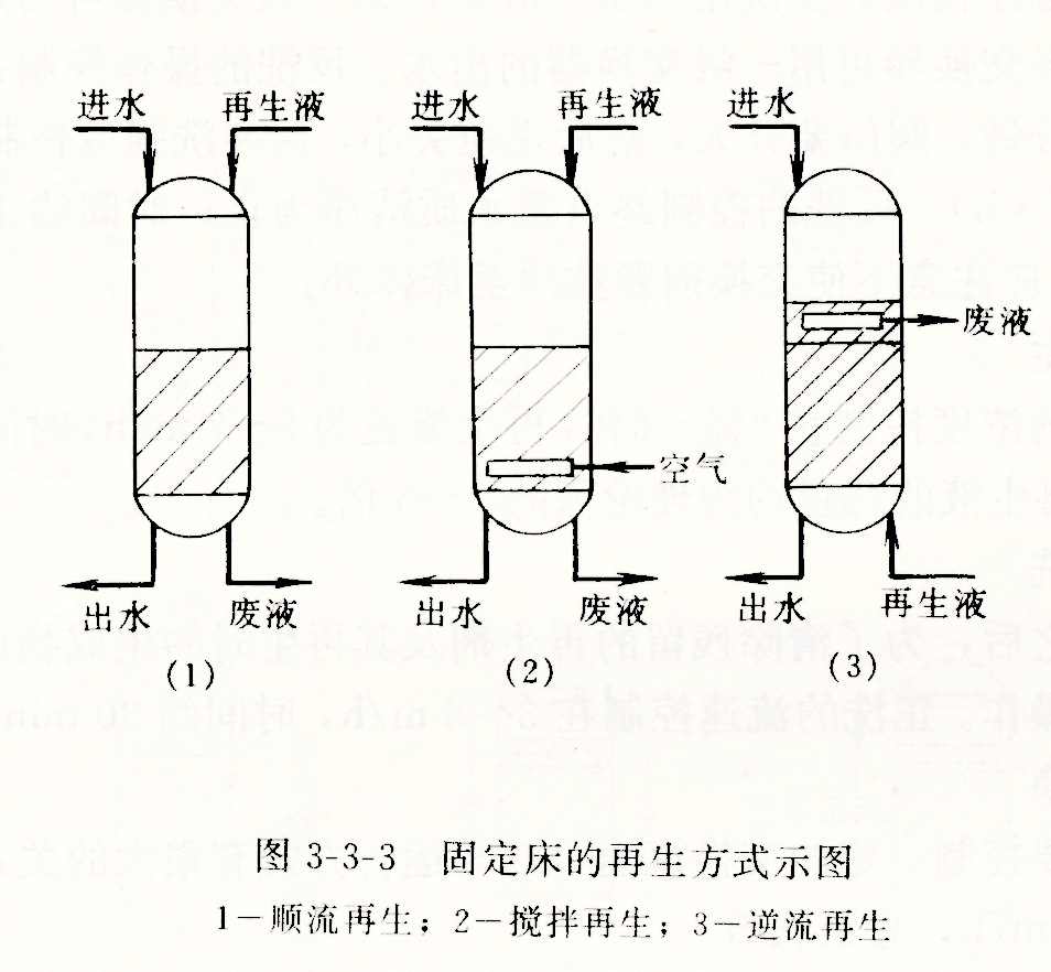 2013年04月10日順流再生方式運行時水流的方向和再生時再生液流動的方向是一致的,通常運行時的水流方向和再生液是由上而下.流動的。順流再生有的增設空氣攪拌。逆流再生方式是運行時水流的方向和再生時再生液流動的方向相反。通常交換時水的流向自上而下流動的;而現生時再生液的流向是從下而上.流動的。它們都各自有其特點,但以逆流再生的方式比較好。固定床離子交換的兩種再生方式如圖3-3-3所示: