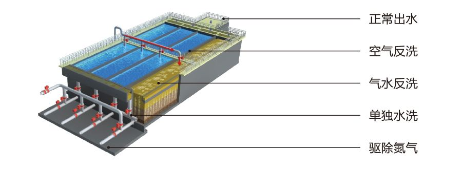 快濾池,快濾池又分普通快濾池和雙層濾池兩種,用于進水濁度小于20mg/L,短期內可以小于50 mg/L.用于大中小型水處理廠,一般單池面積不大于100 m2。普通快濾池的運行管理方便,但閥件多,滲漏多,需有專設沖洗設備。