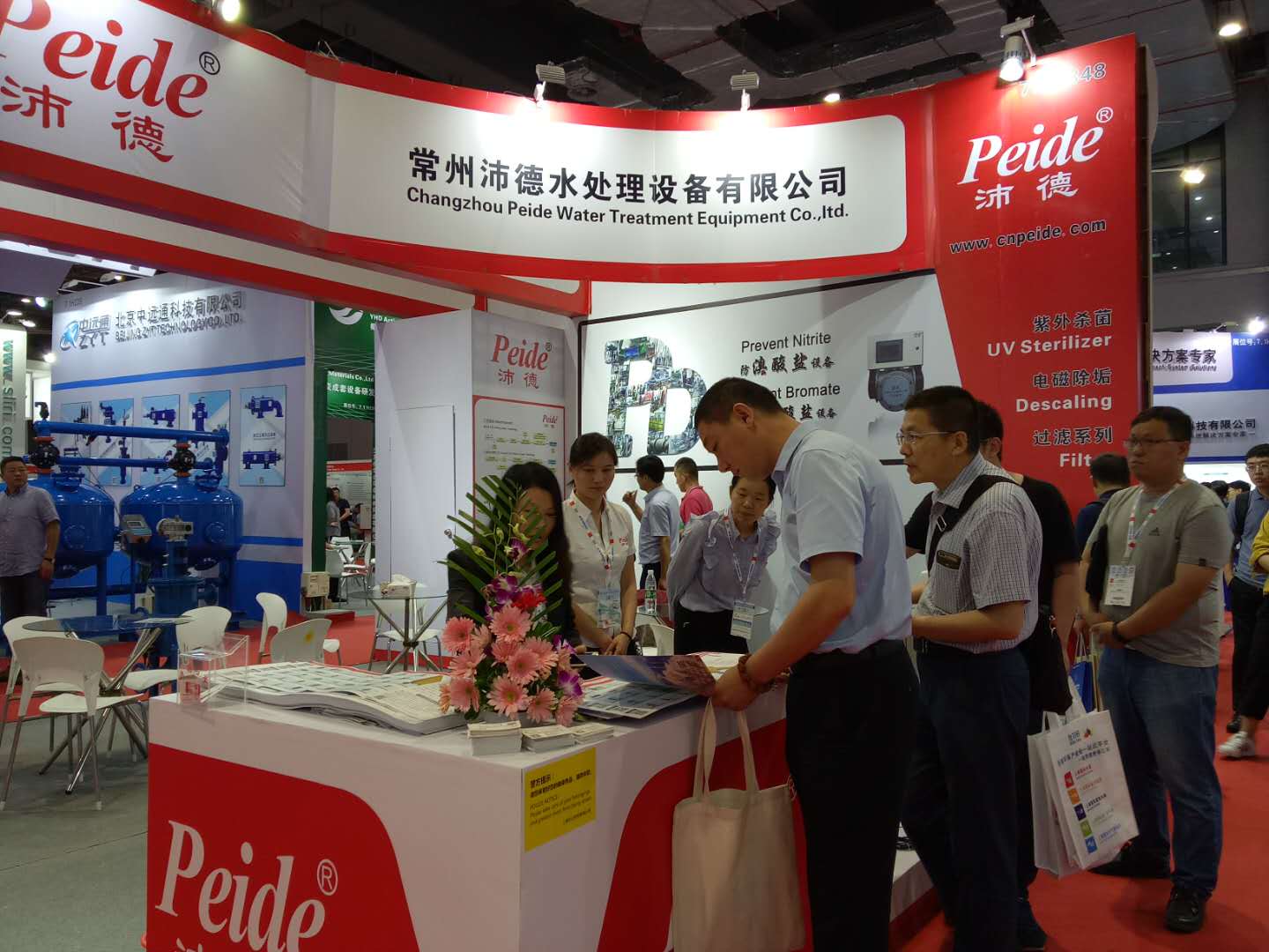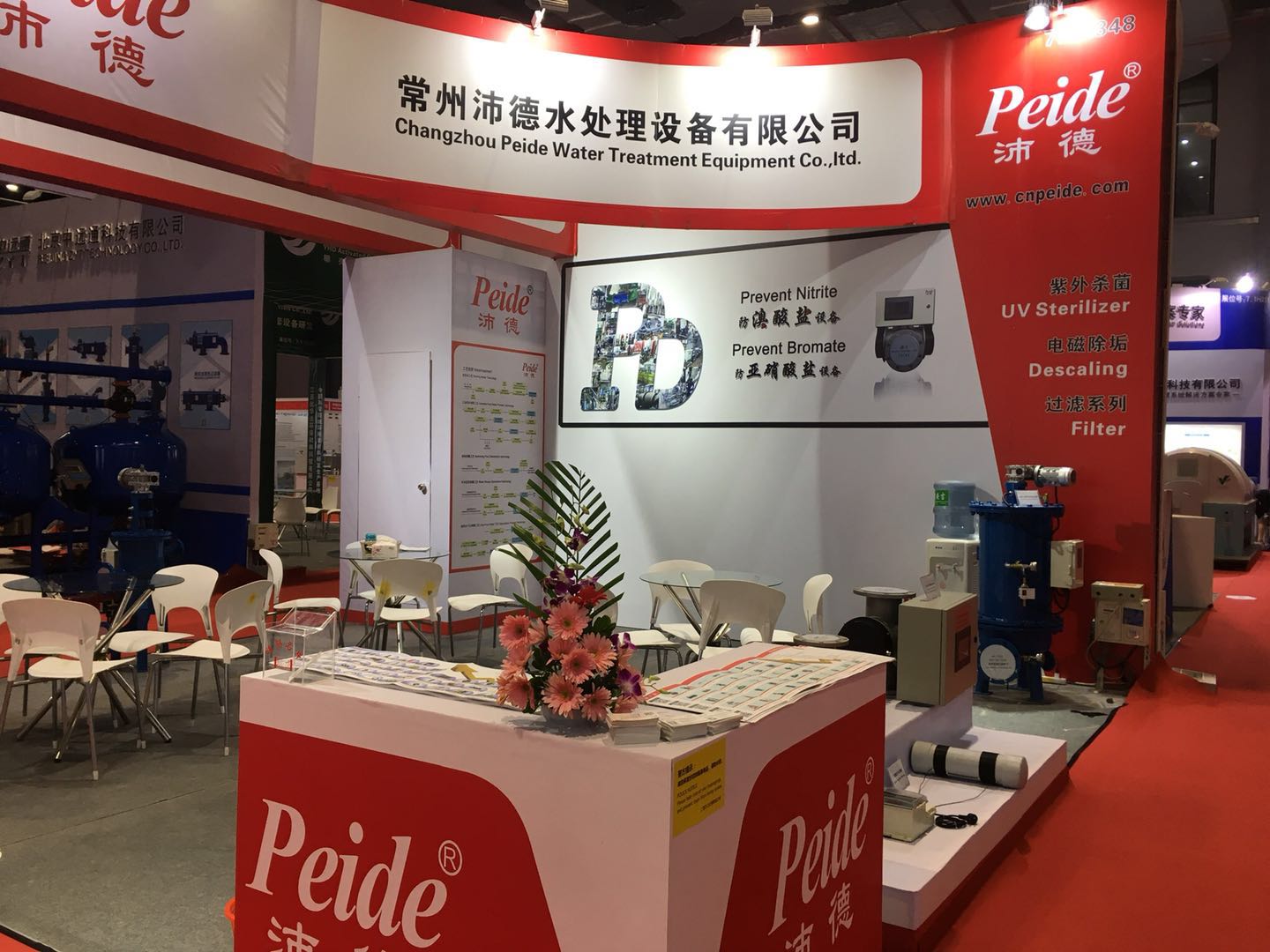 沛德水處理本次展臺的空間布局、光影色調、展臺搭建,展柜制作、材料色板、樣品陳列方式等以精致、大氣的設計及紅白相間的展板在展會上顯得格外奪目,展現了沛德水處理現代化、創新的企業理念,具有良好的觀賞效果,展示了公司產品及形象,展示了公司的實力和發展前景。除此之外兩側海報所展示的水處理設備典型現場案例也吸引了許多來訪者的駐足咨詢。給前來觀展的客商留下了深刻的印象。